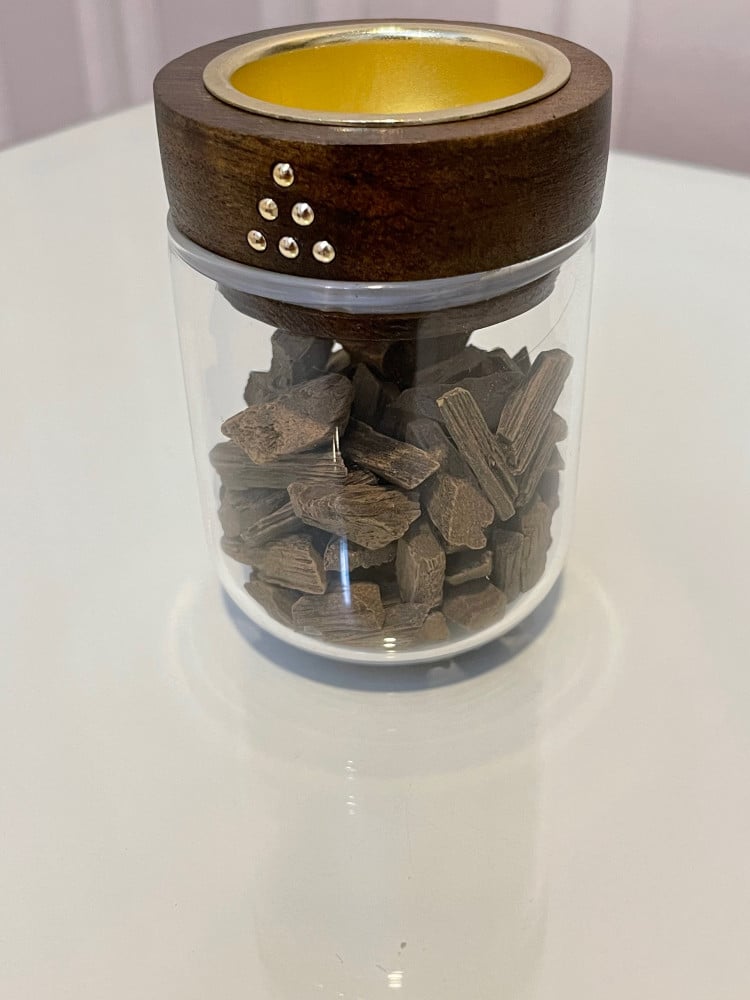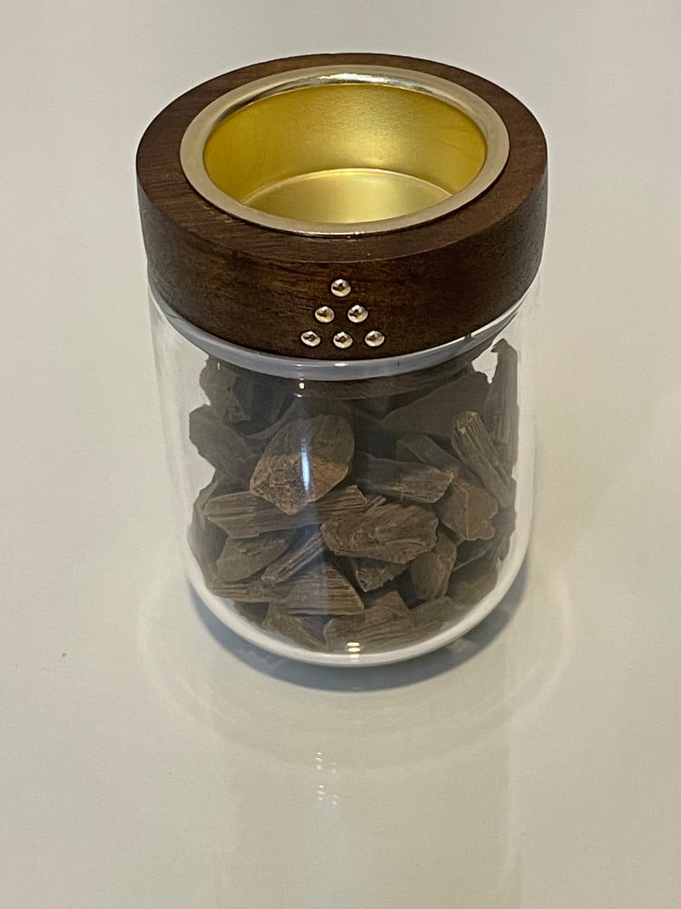 مبخرة بقاعدة زجاجية تحتوي على اوقية من البخور (دقة الدقة طليعي محسن )